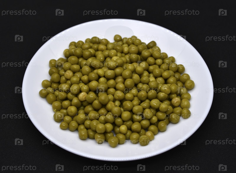 Консервированный горох на белой тарелке. Вкусный свежий горох