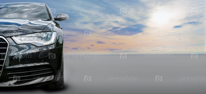 Черный престижный автомобиль на дороге на фоне восхода солнца