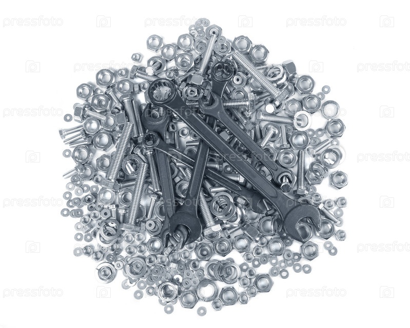 Гаечные болты и гаечные ключи на белом фоне в виде шестиугольника