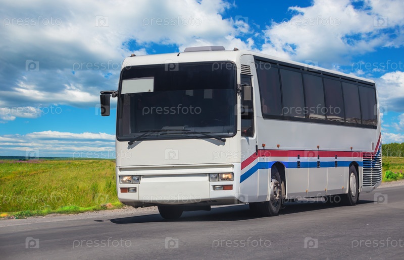 Туристический автобус движется по проселочной дороге