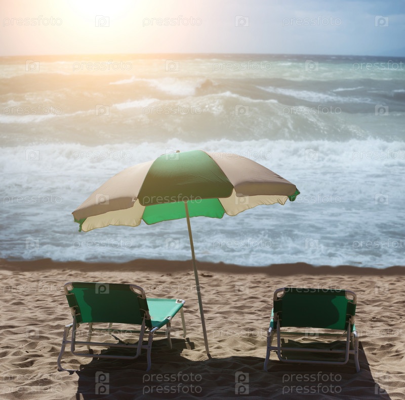 Два шезлонга и зонтик на песчаном пляже у моря
