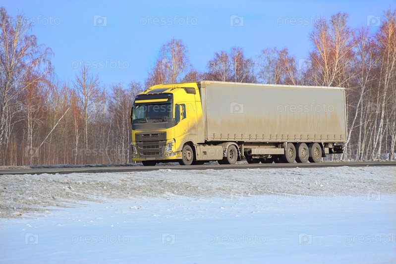 Грузовик едет по зимнему снежному шоссе