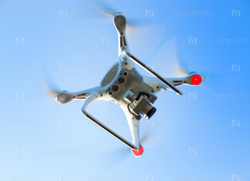 Летающий дрон в голубом небе