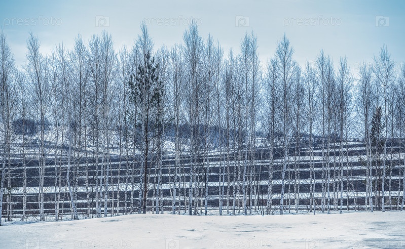 Зимний пейзаж с березовым полем и холмами