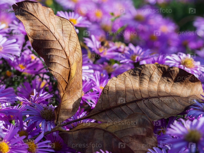Крупный план осеннего коричневого листа, падающего на цветочный фиолетовый луг из цветов астры. Текстурированный опавший лист грецкого ореха. Осенняя открытка