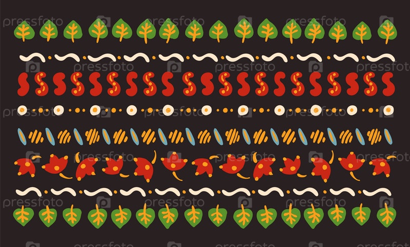 Набор этнических элементов. Бордюр представляет собой полосу с цветами, листьями, ветками, вензелями. Народная вышивка. Славянский, украинский, русский мотив. Хохлома, матрешка, дымковская игрушка. Мексиканский, индийский, цыганский ковер. Вязаное кружево