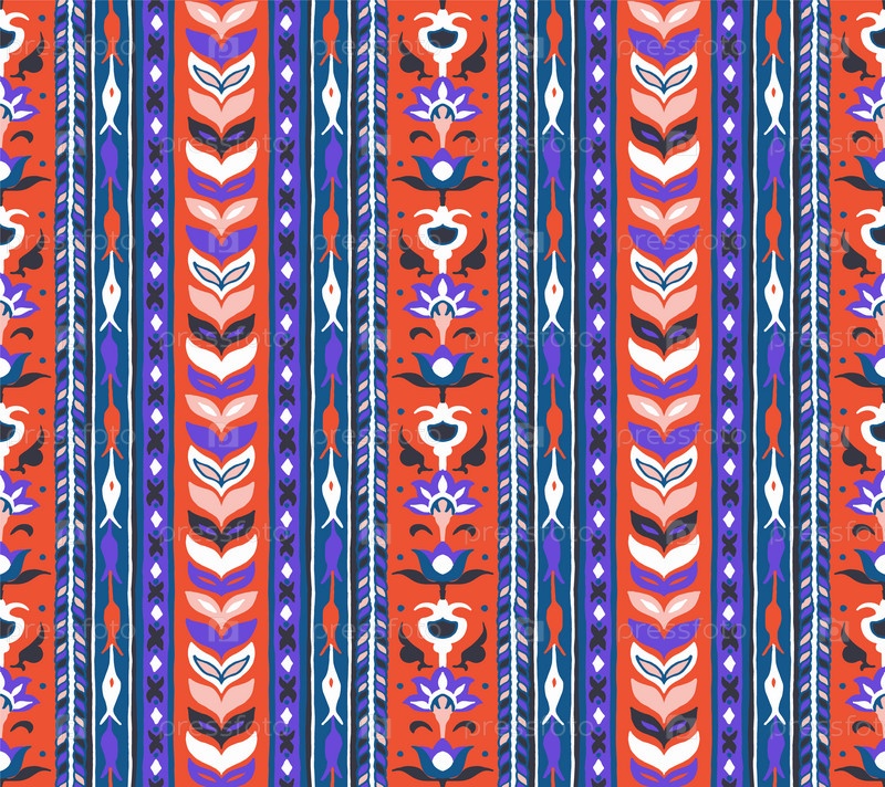 Геометрический дамасский орнамент. Икат границы. Этническая вышивка с листьями и монограммами. Племенная векторная текстура. Бесшовный народный узор в ацтекском стиле. Индийский, скандинавский, цыганский, мексиканский, африканский ковер