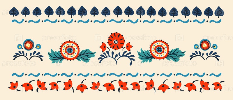 Набор этнических элементов. Бордюр представляет собой полосу с цветами, листьями, ветками, вензелями. Народная вышивка. Славянский, украинский, русский мотив. Хохлома, матрешка, дымковская игрушка. Мексиканский, индийский, цыганский ковер. Вязаное кружево