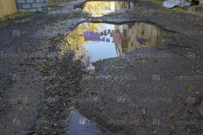 Дорожная яма с лужей воды и отражением