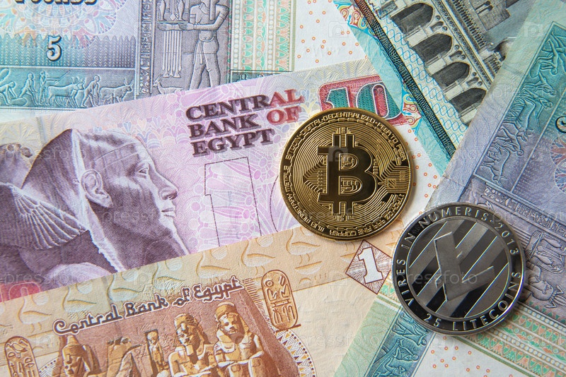 Банкноты египетских фунтов и монеты криптовалюты. Концепция инвестиций в криптовалюту. Майнинг или торговля криптовалютой