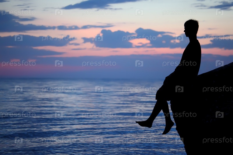 Силуэт парня, сидящего на волнорезе вечером у моря
