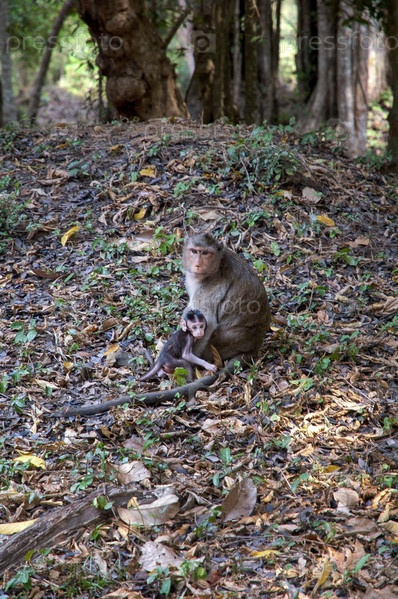 Забавная обезьяна в Ангкор-Ват (макаки-резусы)