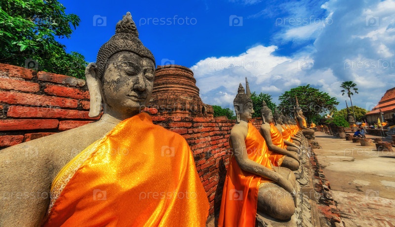 Выровненные статуи Будды в храме Ват Яй Чаймонгкол Аюттхая, Бангкок, Таиланд