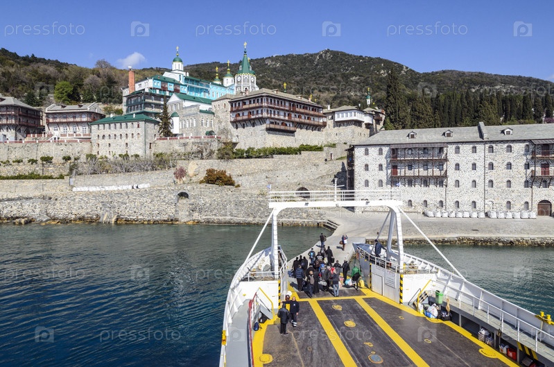 Афон, Греция - 27 марта 2017 г.: Русский православный монастырь Святого Пантелеимона на горе Афон, Агион Орос, Святая гора, Халкидики, Греция и паром с паломниками