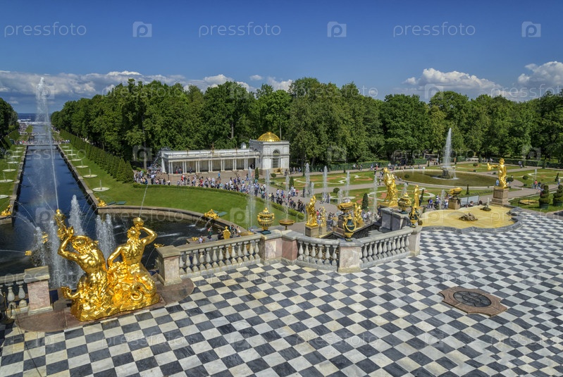ПЕТЕРГОФ, РОССИЯ - 29 июня 2017 г.: Живописный вид с террасы Петергофского дворца, Россия, 28 августа 2016 г. Дворцово-садовый комплекс Петергоф признан объектом Всемирного наследия ЮНЕСКО