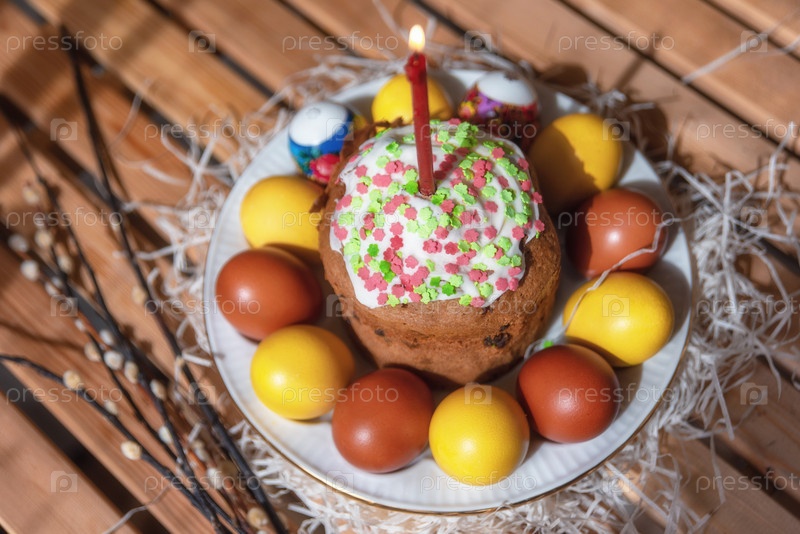 Пасхальные яйца и торт со свечой на ярком деревянном фоне