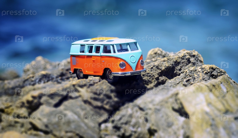 Винтажный миниатюрный оранжевый и синий фургон. Концепция путешествия