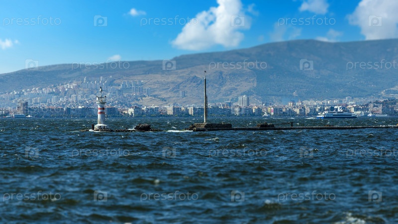Измир, Турция - 14 июня 2017 г.: Прибрежный городской пейзаж с современными зданиями и кораблями. Центральная часть города Измира, Турция, неопределенные люди ходят по набережной