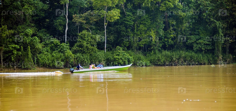 Кинабатанган, Малайзия - 9 мая 2013 г.: Туристы в круизе на лодке по реке Кинабатанган, одной из самых разнообразных концентраций дикой природы на Борнео