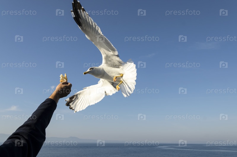 Кормление чаек из рук хлебом