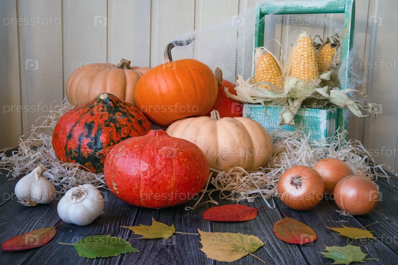 Деревянный стол украшен овощами, тыквами, кукурузой и осенними листьями. Осенний фон. Концепция Дня благодарения или Хэллоуина