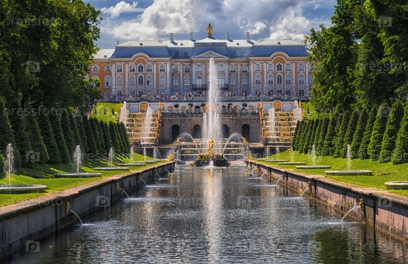 САНКТ-ПЕТЕРБУРГ, РОССИЯ - 29 июня 2017 г.: Большой дворец и Большой каскад фонтанов в Петергофе