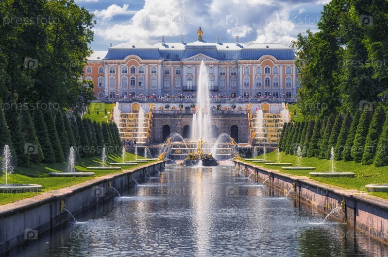 САНКТ-ПЕТЕРБУРГ, РОССИЯ - 29 июня 2017 г.: Большой дворец и Большой каскад фонтанов в Петергофе