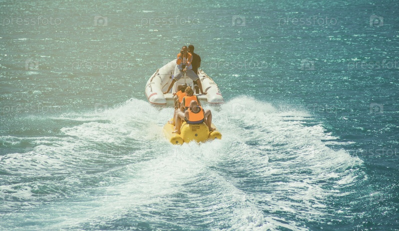 Эль-Гуна/Египет - 11 апреля 2015 г.: Морской аттракцион, счастливые люди катаются на надувной лодке
