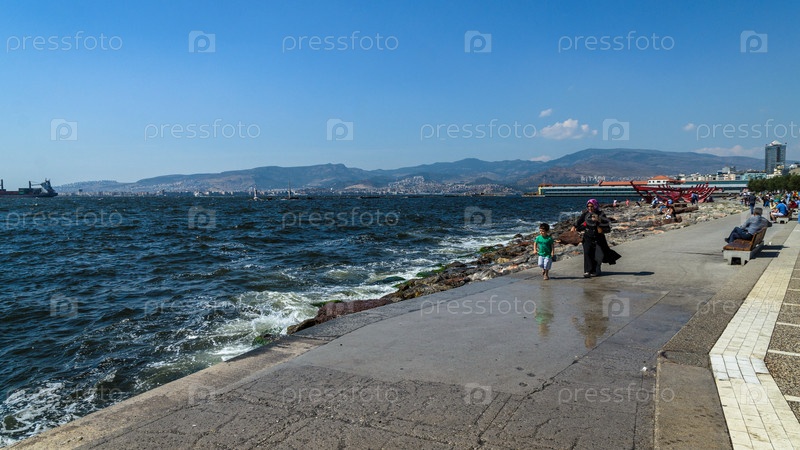 Измир, Турция - 14 июня 2017 г.: Прибрежный городской пейзаж с современными зданиями и кораблями. Центральная часть города Измира, Турция, неопределенные люди ходят по набережной