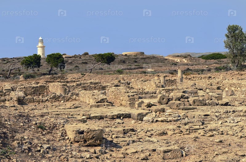 Белый маяк на фоне гор и древних руин в археологическом парке Пафоса, Кипр