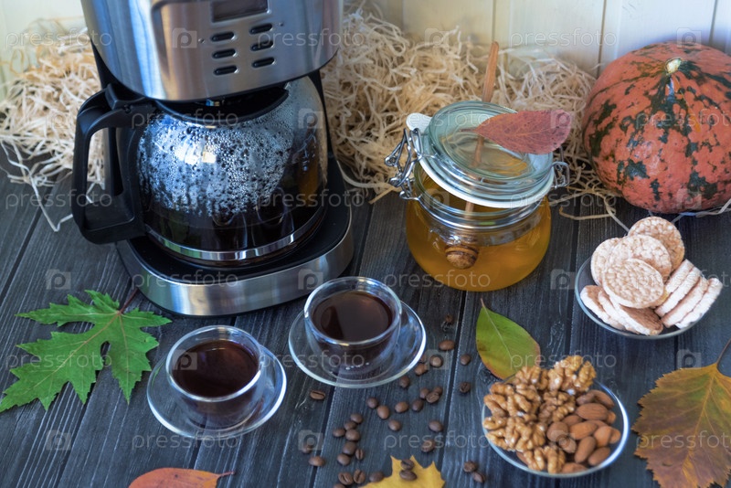 Осенний натюрморт с чашкой кофе и медом на столе с орехами и фасолью
