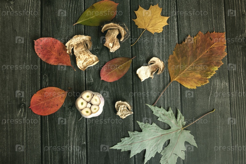 Осенний фон с сушеными грибами, чесноком и тыквой. Сухие листья деревьев. Естественный деревянный фон. Плоская планировка, вид сверху