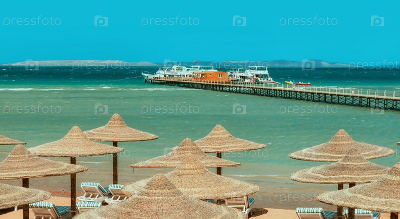 Шезлонг и зонтики на пляже на фоне голубого неба и моря. Египет, Хургада