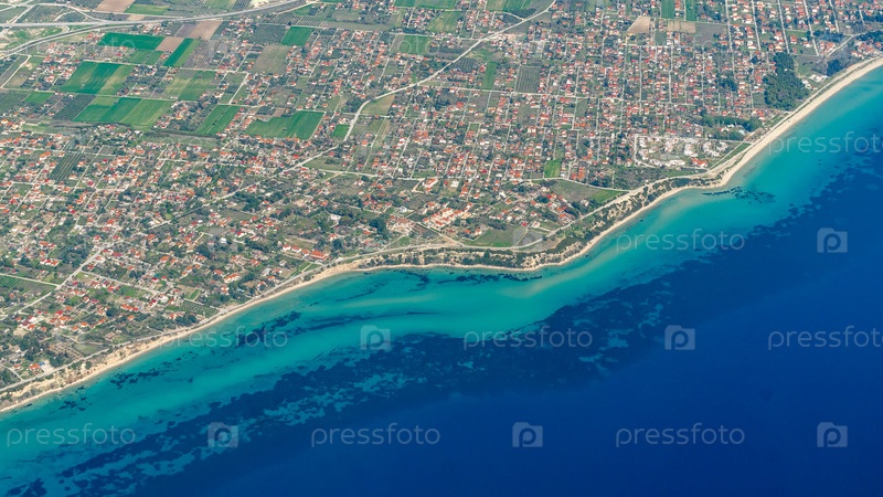 Вид с воздуха на поля с традиционным греческим сельским хозяйством из окна самолета