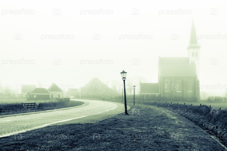 Церковь Ден Хорн осенним туманным утром на острове Тексел в Нидерландах