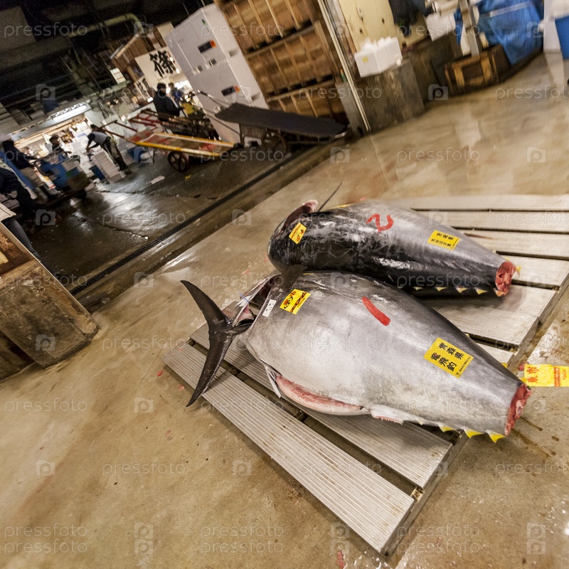 Рано утром на рыбном рынке Цукидзи. Тунец готов к аукциону. Токио, Япония