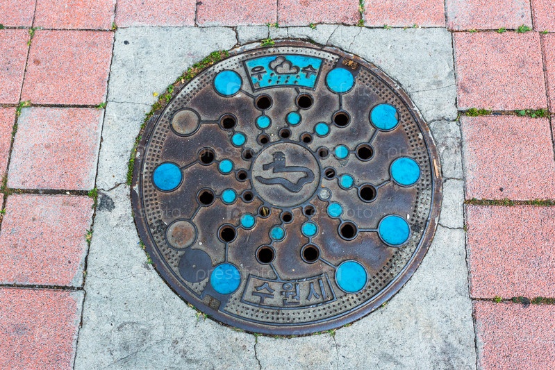 Круглый канализационный люк на улице в центре Сеула