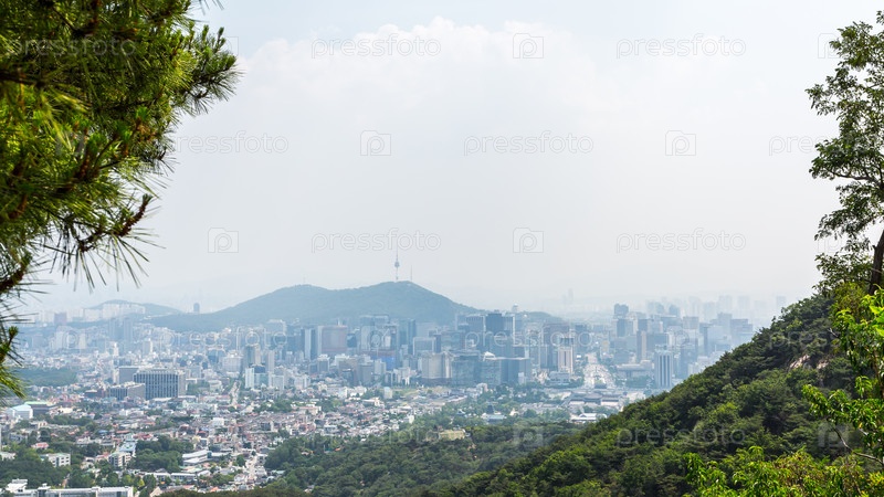 Вид на дворец Кенбоккун и площадь Кванхвамун с горы Бэгак, Сеул, Южная Корея