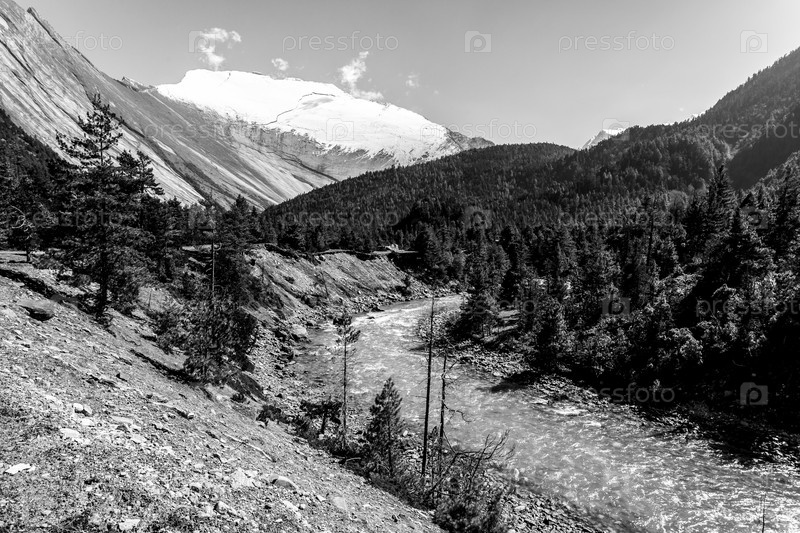 Долина реки Марсянди. Гималаи, заповедник Аннапурны. Горная река в Непале