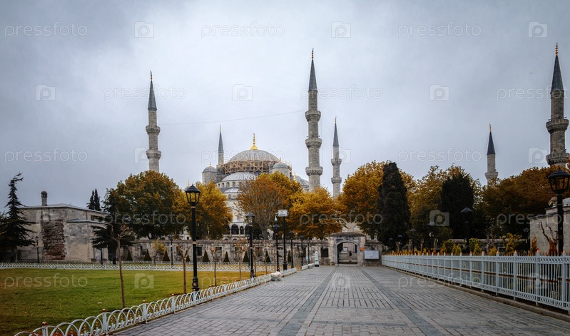 Голубая мечеть Султана Ахмеда в Стамбуле, Турция — одна из самых популярных достопримечательностей города. Близкий вид днем с облачным небом