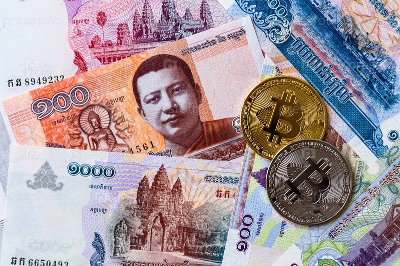 Фон сложенного камбоджийского риэля - KHR, официальная валюта Камбоджи против криптовалюты