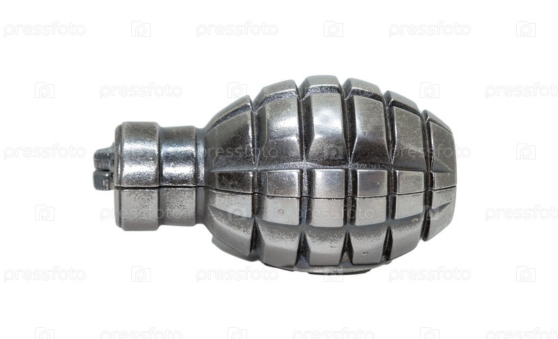 Одиночная серебряная металлическая граната - зажигалка на белом фоне и копировальным пространством
