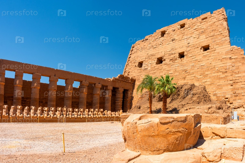 Древние руины Карнакского храма в Луксоре (Фивы), Египет. Самый большой храмовый комплекс древности в мире. Всемирное наследие ЮНЕСКО. Вид с аллеи сфинксов