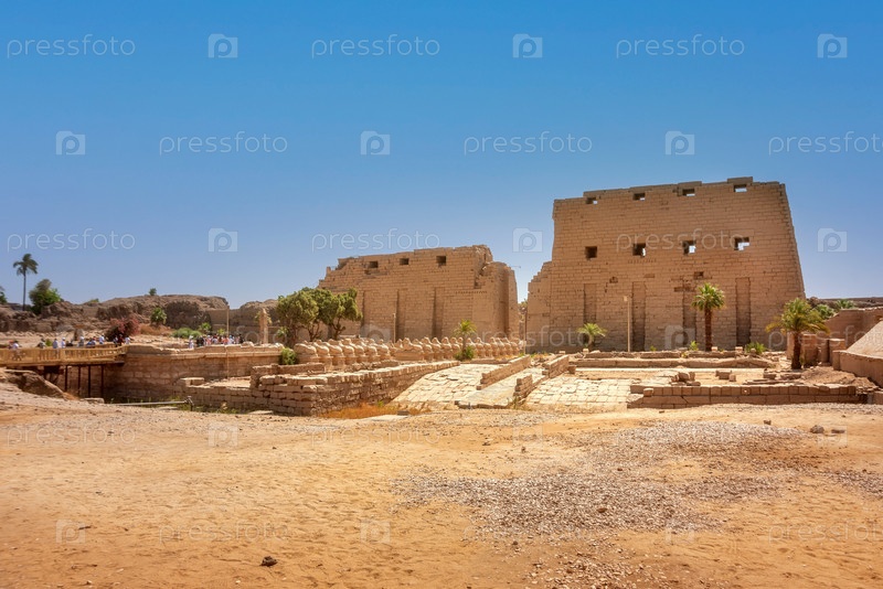 Древние руины Карнакского храма в Луксоре (Фивы), Египет. Самый большой храмовый комплекс древности в мире. Всемирное наследие ЮНЕСКО. Вид с аллеи сфинксов
