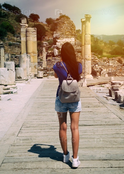 Женщина-туристка наслаждается видом на руины Эфеса в Турции