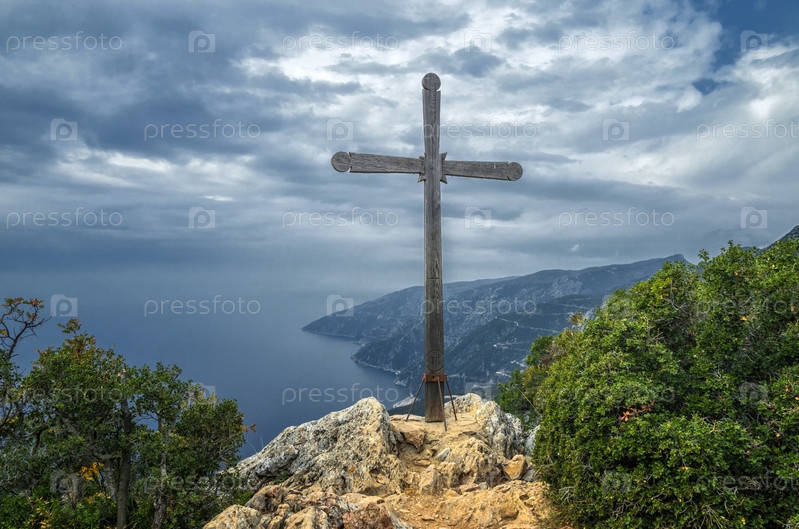 Деревянный крест на скале на горе Афон над морем
