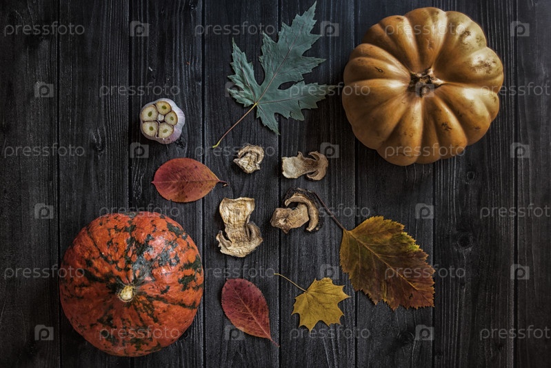 Осенний фон с сушеными грибами, чесноком и тыквой. Сухие листья деревьев. Естественный деревянный фон. Плоская планировка, вид сверху