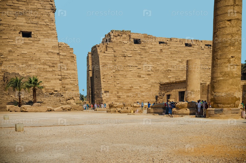 ЛУКСОР, ЕГИПЕТ - 8-ОЕ АПРЕЛЯ: Неопознанные туристы на Луксоре на 08-ое апреля 2015, Египет. Это был самый большой храмовый комплекс бога Амона-Ра в древнем городе Фив