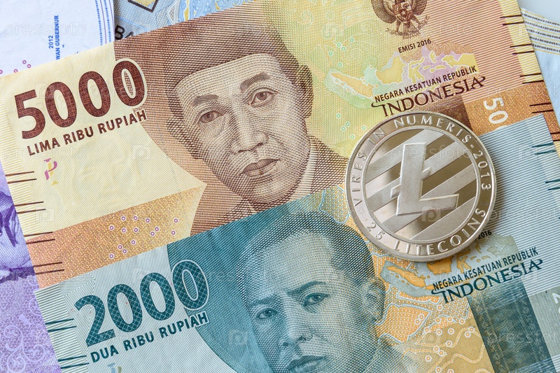 Litecoin с подлинной банкнотой индонезийской рупии.Бизнес и финансовая концепция