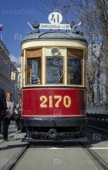 МОСКВА, РОССИЯ - 21 апреля 2018 г.: Ретро-трамваи выходят на парад на пустой старой городской улице Москвы, Россия, 21 апреля 2018 г